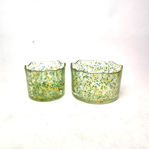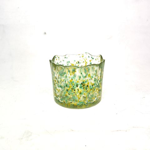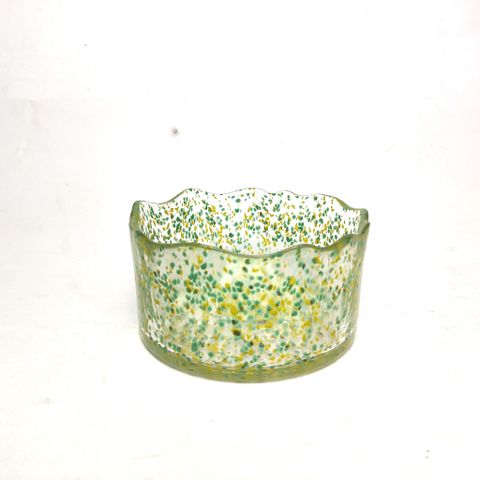 Handmade glass wax container with irregular edges and wide opening, featuring a dual-color dot design.