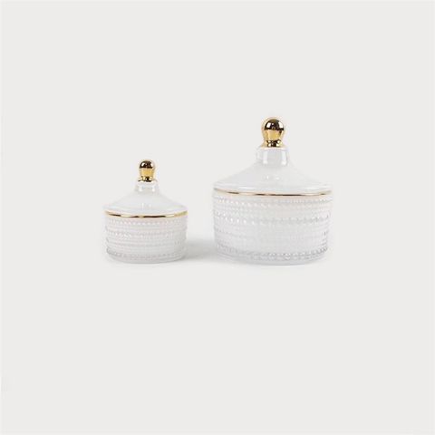 Regular polka dot pattern, gold-painted edges and handles.