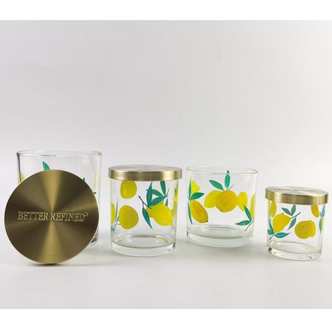 Hand-painted lemon pattern candles glass jar, which can be paired with wooden lids, bamboo lids, or metal lids. Customizable hand-painted patterns and lid logos are available.